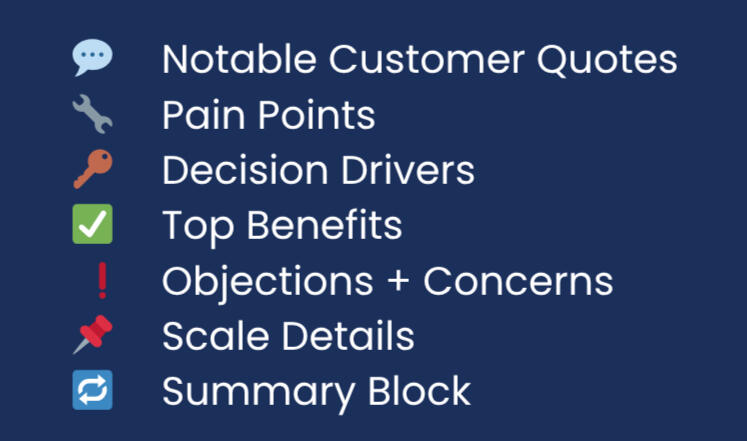 Their biggest pain points, decision drivers, top benefits, recurring roadblocks, and exactly what closes or kills deals.The insights hidden in their feedback are your unfair advantage.Your competitors have the same data.